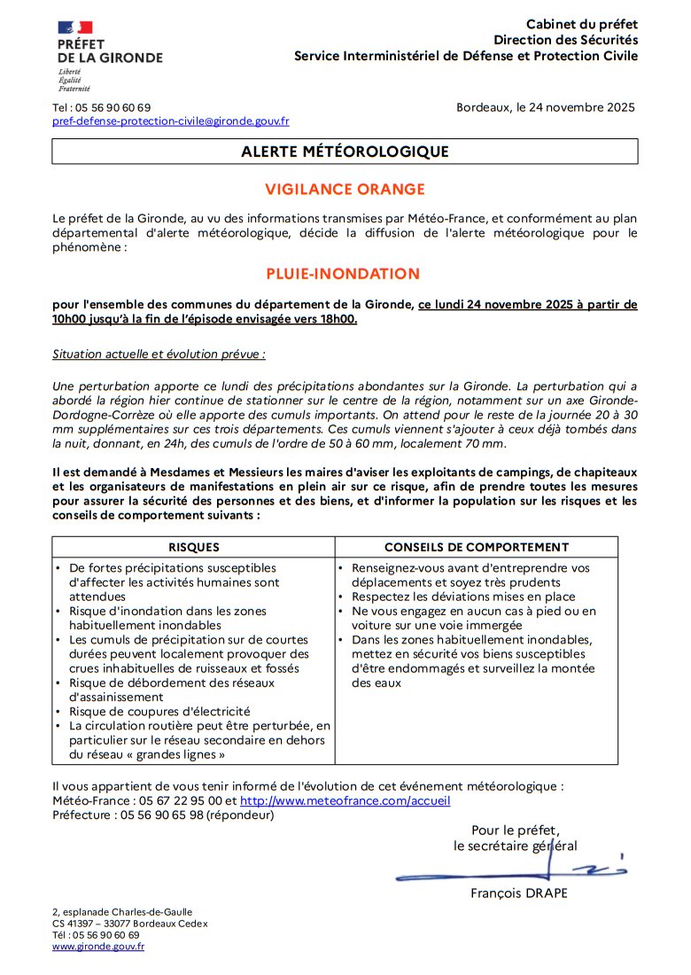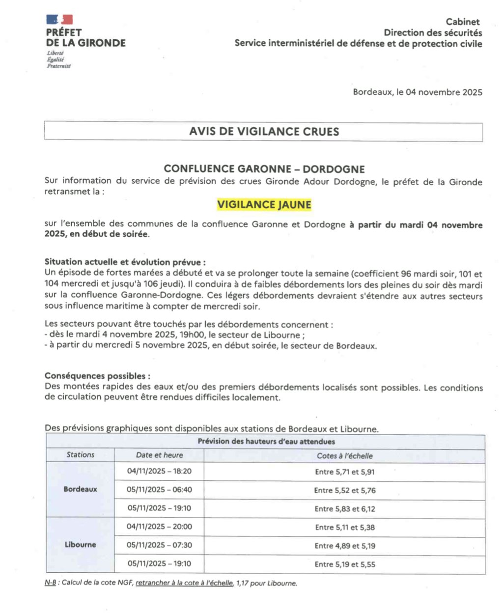 Avis de vigilance jaune Crues annoncé par la préfecture de la Gironde dès ce jour.