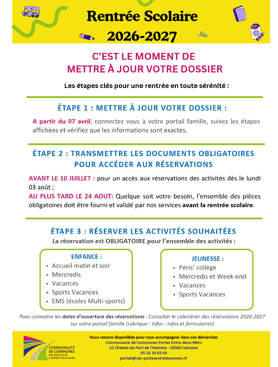 Pour toutes autres démarches pour la scolarité de votre enfant à l'école primaire rendez-vous sur le portail de la CDC des Portes de l'Entre-Deux-Mers.